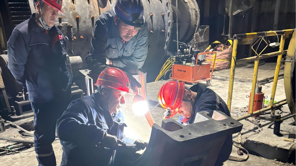 故障發(fā)生后,白玉銀興公司經(jīng)理田東清迅速抵達(dá)現(xiàn)場,根據(jù)設(shè)備故障狀況進(jìn)行現(xiàn)場研判并采取果斷措施進(jìn)行停機(jī)搶修。在搶修現(xiàn)場,黨員干部主動亮身份、扛重?fù)?dān),充分發(fā)揮先鋒模范作用,成為搶修隊伍中的“主心骨”。田東清帶領(lǐng)維修團(tuán)隊趴在設(shè)備旁仔細(xì)排查故障點(diǎn),在刮瓦環(huán)節(jié)精細(xì)操刀,憑借多年豐富經(jīng)驗(yàn)和專業(yè)技術(shù)儲備,勾畫出完美的弧線。為了加快搶修進(jìn)度,搶修人員放棄休息時間,輪班作戰(zhàn)、每天連續(xù)工作16小時,累了就趴在桌上短暫小憩,始終堅守在搶修一線。食堂將飯菜、飲用水送到現(xiàn)場,確保搶修人員有充沛的體力。